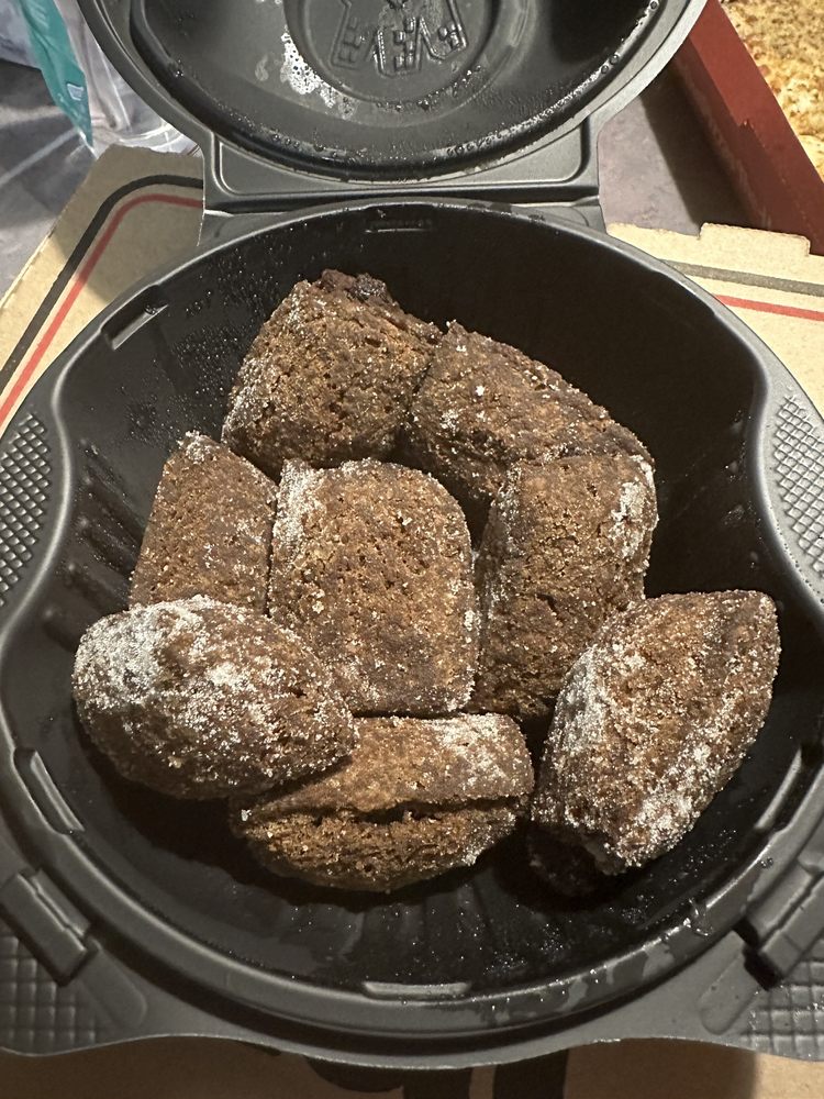 8 warm, chocolatey cake-donut bites stuffed with a decadent chocolate filling & tossed in sugar.